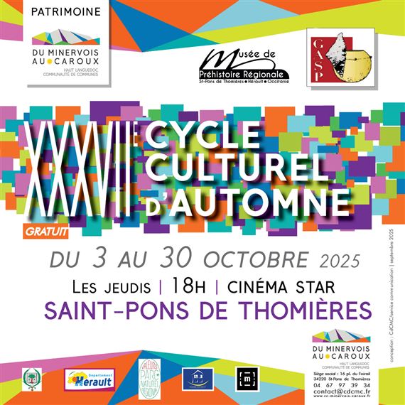Le Groupe Archéologique Saint-Ponais et la Communauté de communes du Minervois au Caroux remercient le Conseil Départemental de l’Hérault, et la Commune de Saint-Pons de Thomières pour leur soutien à l’organisation du Cycle Culturel d’Automne.